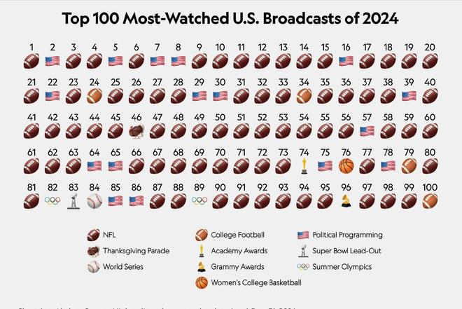 这也是过去几个赛季NBA整个收视率萎靡的缩影,根据知名体育商业媒体Sportico统计,24年全美收视率前百的比赛中没有NBA比赛。